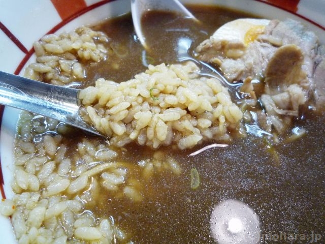 麺を食べ終わってから、底に沈んでいるご飯をすくって食べます。